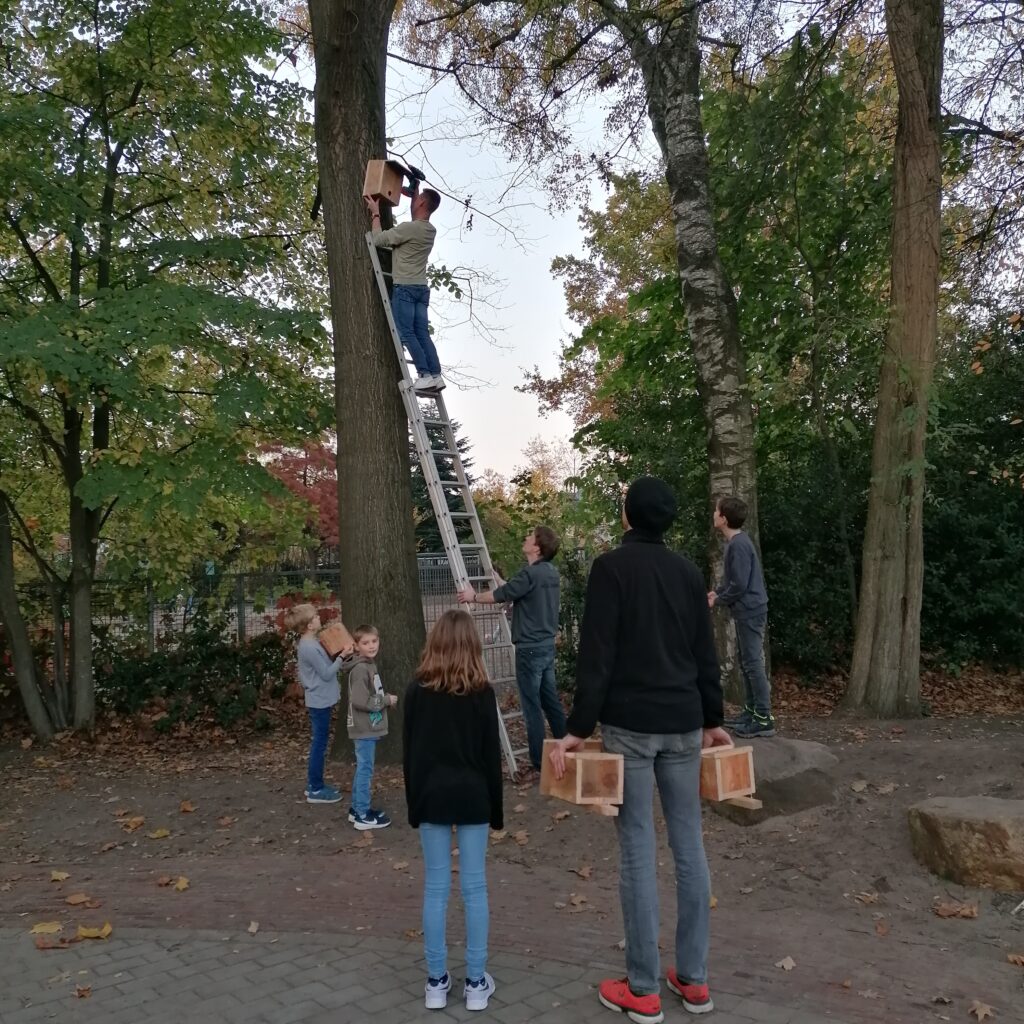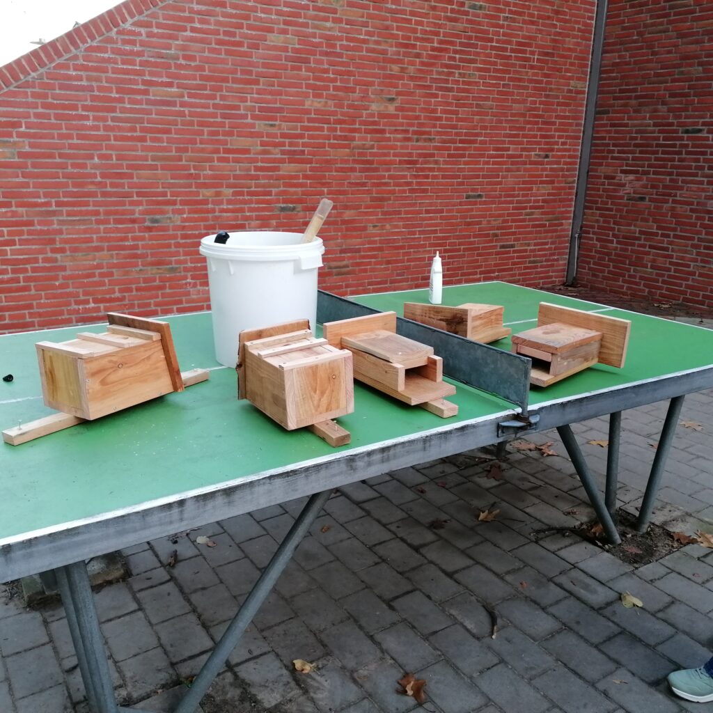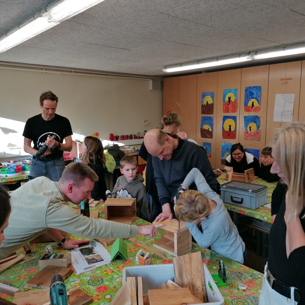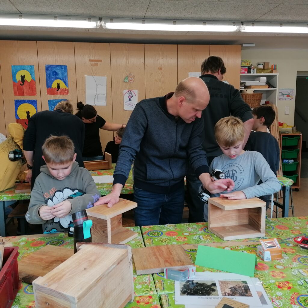 Am Freitag, den 7.11.25, trafen sich an der Roggenkampschule ungefähr 20 Kinder, die zusammen mit einigen Eltern, Großeltern und Lehrerinnen Nistkästen, Fledermausquartiere und ein großes Insektenhotel bauen wollten.
