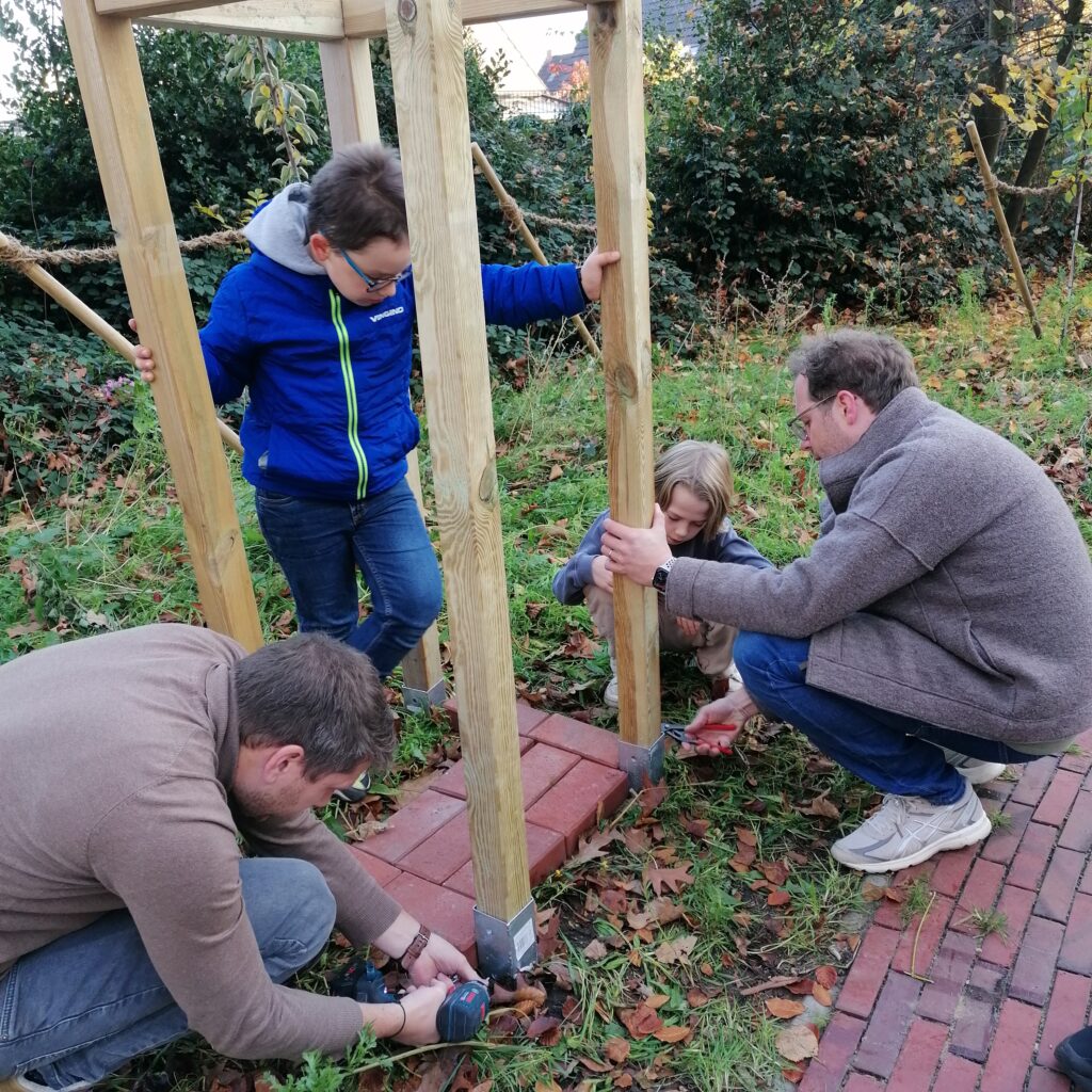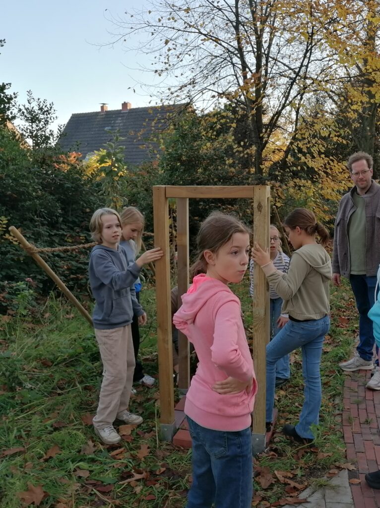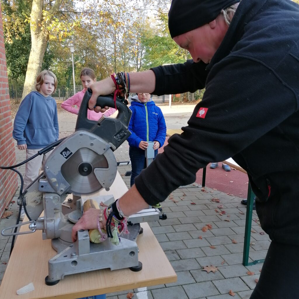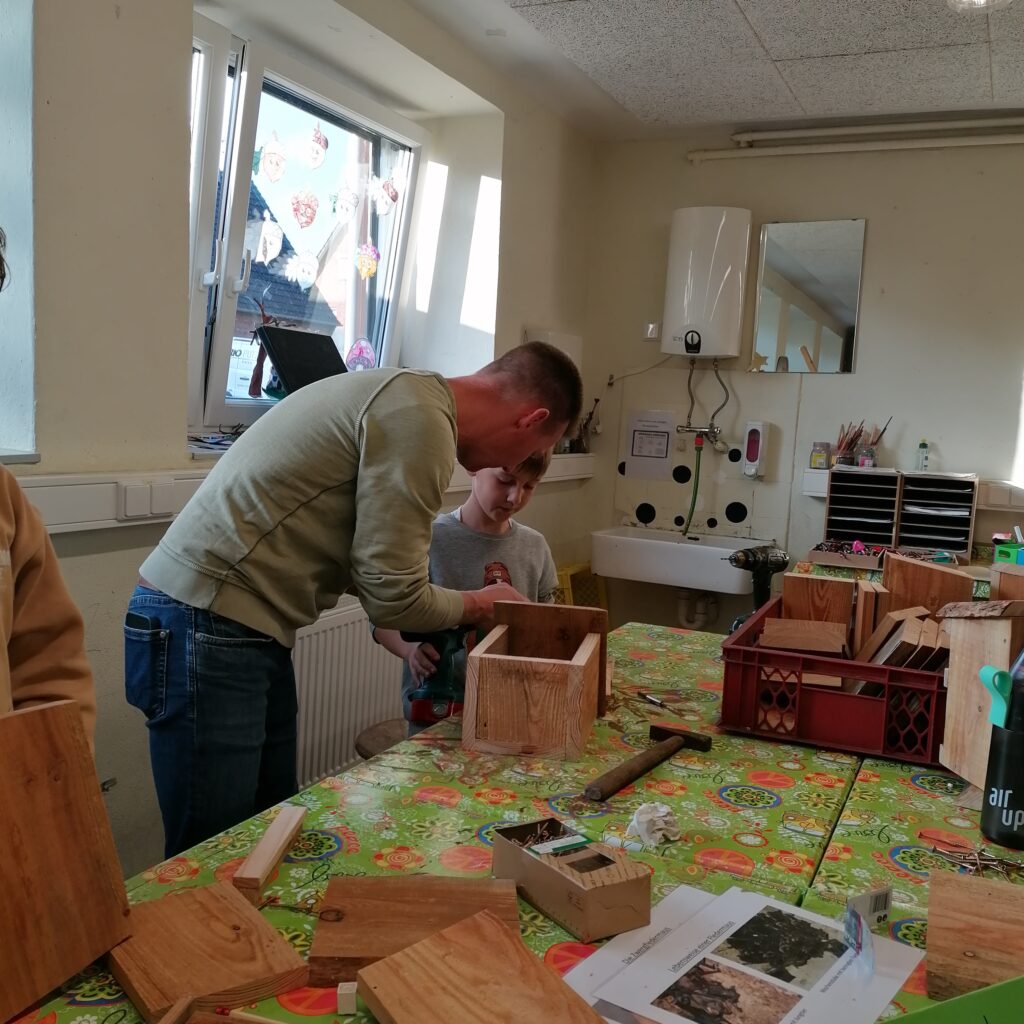 Am Freitag, den 7.11.25, trafen sich an der Roggenkampschule ungefähr 20 Kinder, die zusammen mit einigen Eltern, Großeltern und Lehrerinnen Nistkästen, Fledermausquartiere und ein großes Insektenhotel bauen wollten.