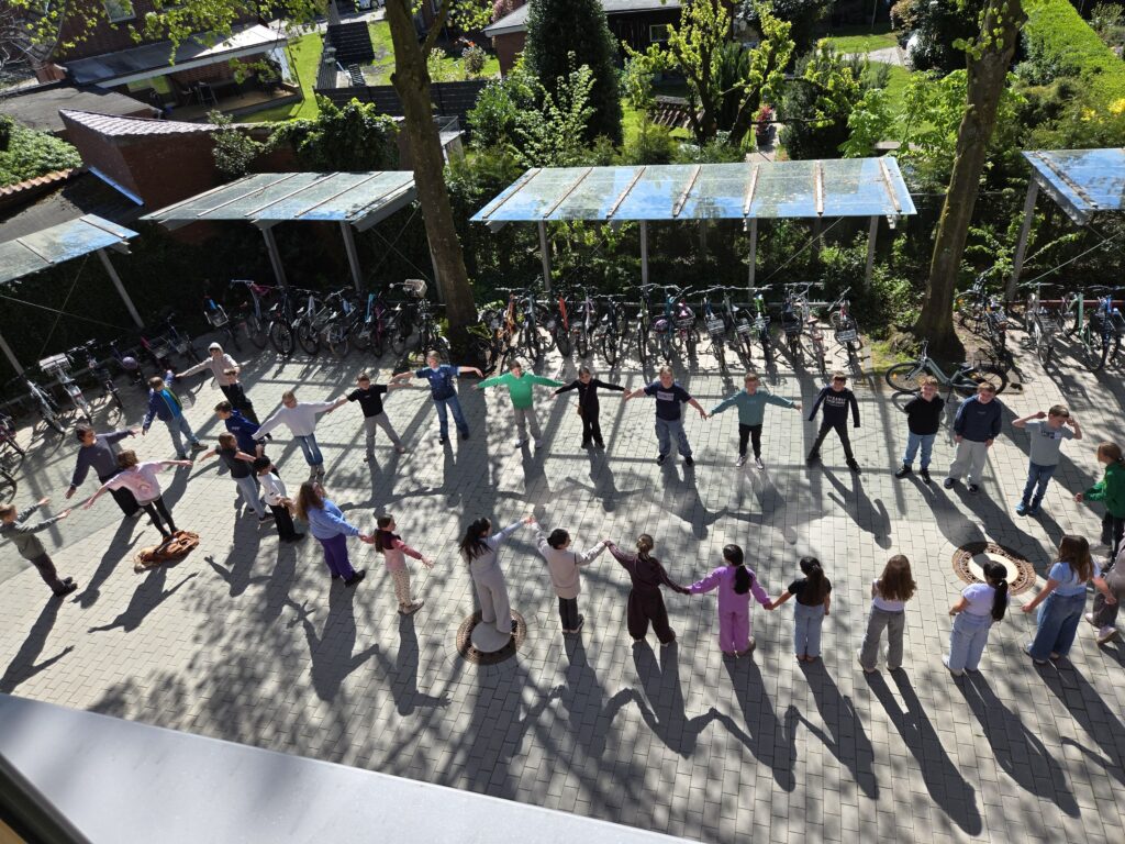 Nachdem ein geeignet großer Platz vor dem Haupteingang gefunden wurde, wurde gemessen, gezeichnet und am Ende der Umriss des Tieres in einer „Menschenkette“ dargestellt, für die die Unterstützung einer weiteren Klasse (4c) benötigt wurde.