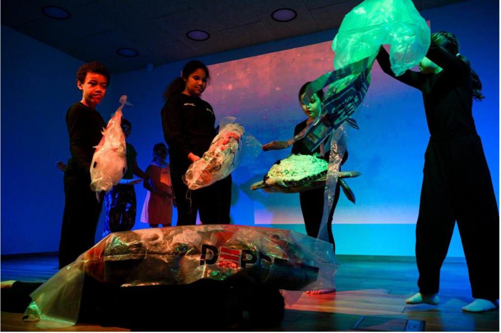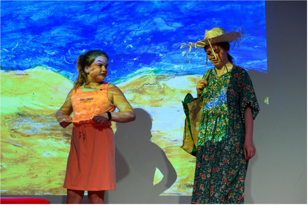 Gemeinsam mit Simone Vrede (Stückentwicklung und Regie) entwickelten die Kinder im ersten Halbjahr 2024/25 mit Kindern unserer und weiterer Schulen Szenarien für das Theaterstück. Im 2. Halbjahr dann erarbeitete Kinga Röder de Jong (Bühnenbild) mit den Kindern Requisiten und Gemälde, die durch Projektionen Teil des Bühnenbilds wurden.