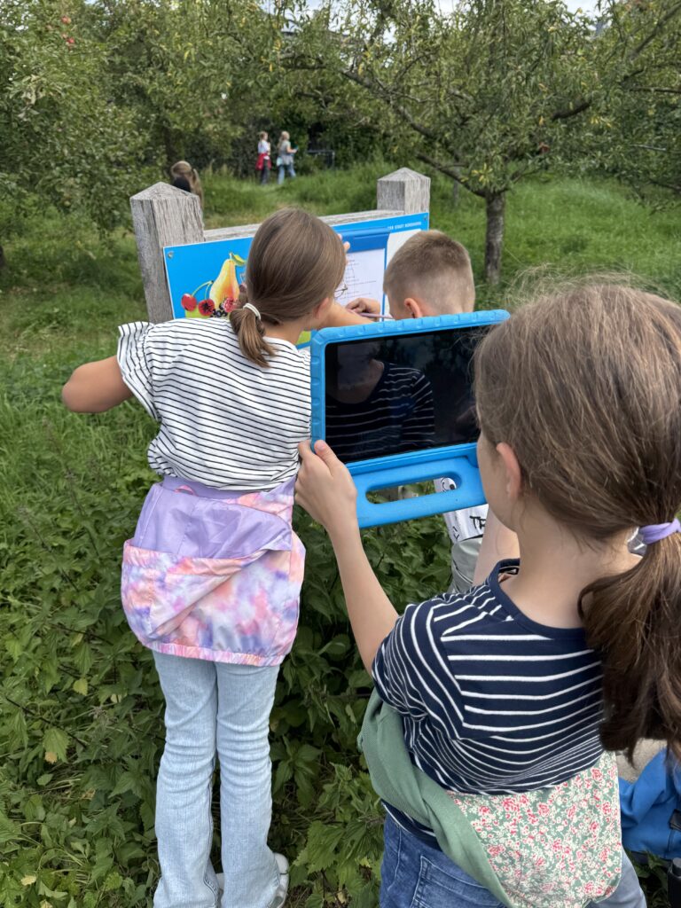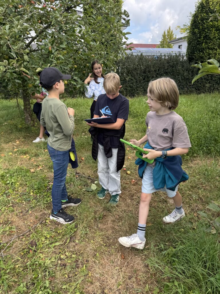 Ausgestattet mit Becherlupen, IPads und Suchaufträgen (Höhe und Anordnung der Bäume, welche Obstarten, welche Tiere und Pflanzen entdecken wir, Höhe des Grases…) machten sich die Klassen alsbald auf den Weg, um die erste fußläufige Streuobstwiese zu erkunden. Für viele Kinder war es der erste Besuch einer Streuobstwiese.