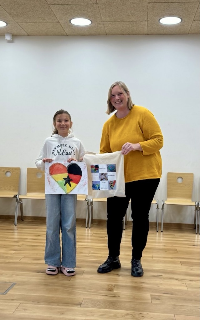 Die Kunstwerke wurden bereits im August beim Sommerfest von Nkwadaa fie ausgestellt. Die offizielle Preisverleihung für die Viertklässler*innen der Grundschule am Roggenkamp fand schließlich am 12. November in der Mensa statt. Jedes eingereichte Bild wurde dabei gebührend gewürdigt. Mila und Viktoria durften sich als Gewinnerinnen über zwei Preise freuen, die ihnen persönlich von Lena Schoemaker von Nkwadaa fie überreicht wurden.