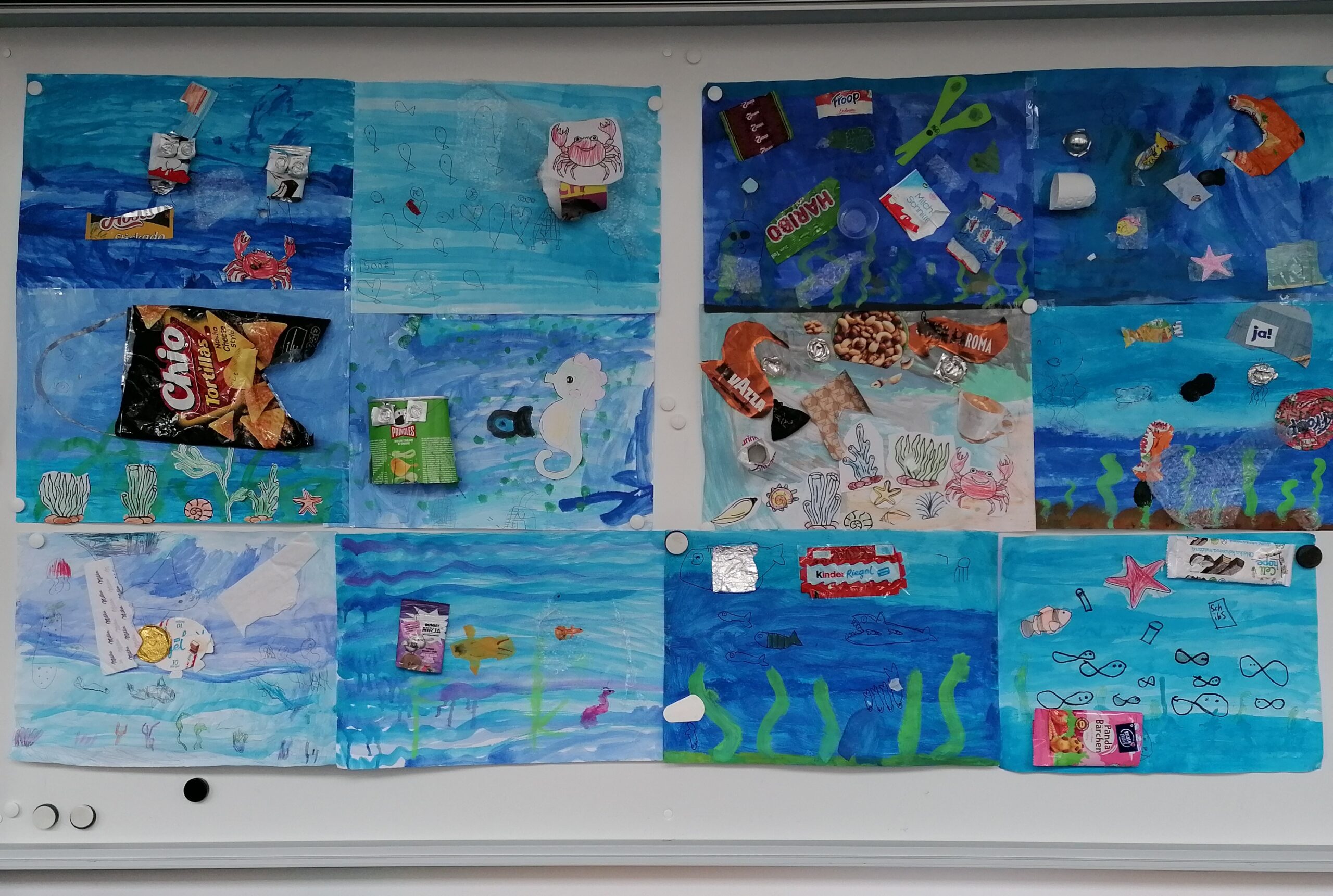 Auch im Kunstunterricht wird das Thema aufgegriffen. Unter dem Schwerpunkt „Verschmutzung der Meere“ setzen sich die Kinder kreativ mit den Auswirkungen von Müll auseinander und gestalten eindrucksvolle Werke.