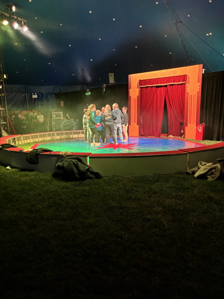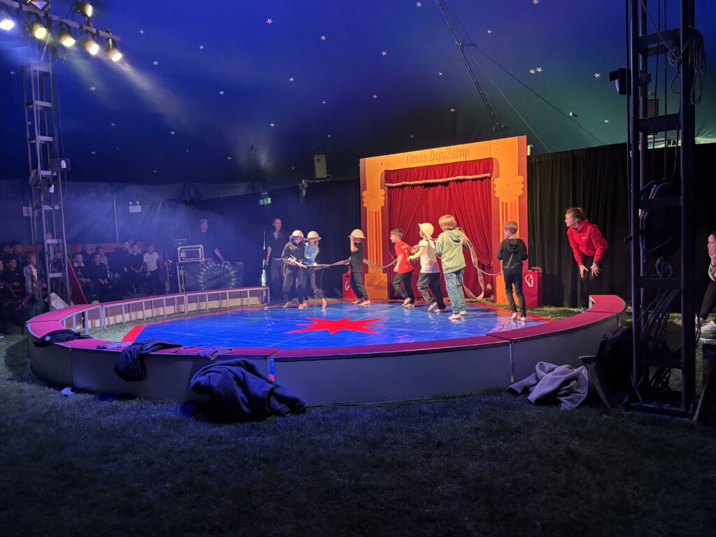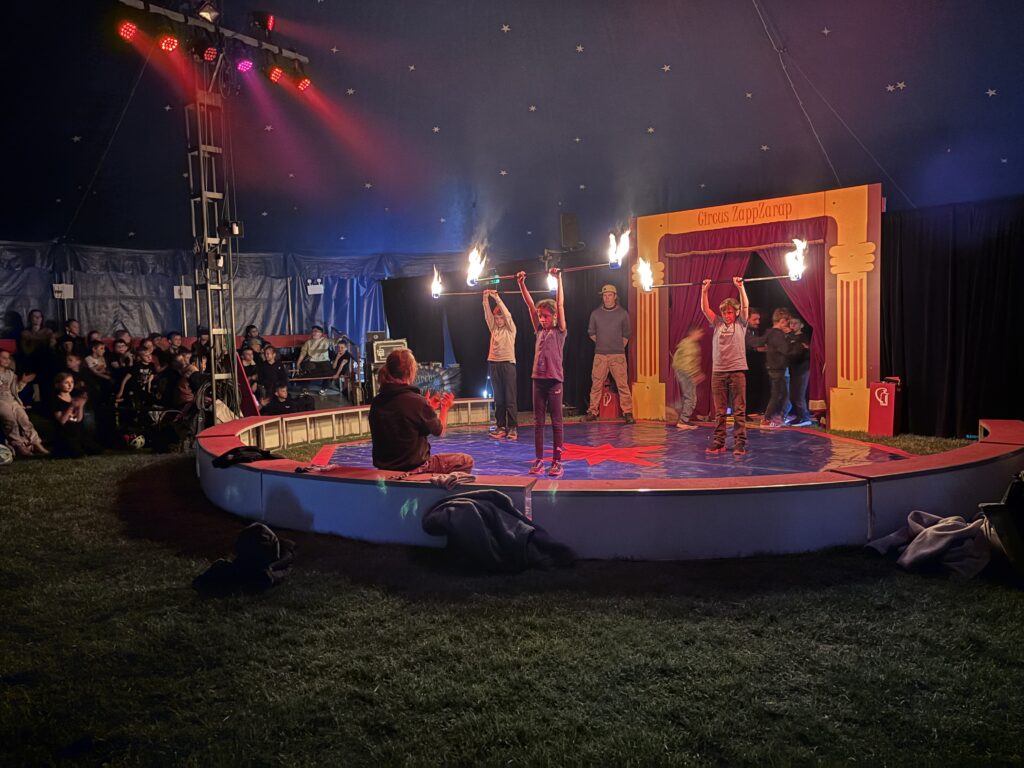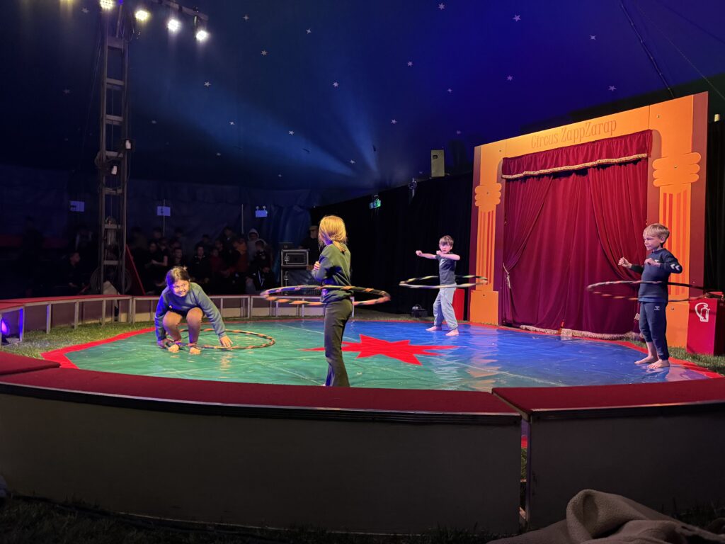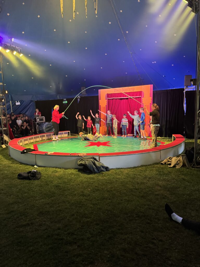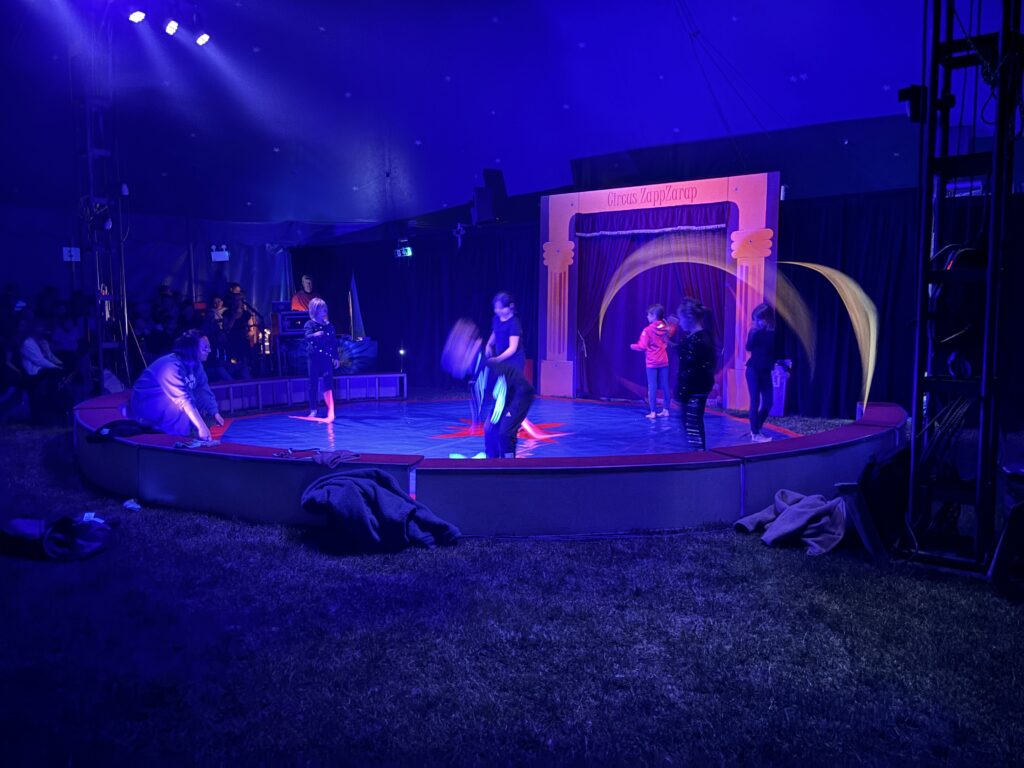 Anschließend ging es in eine lange Trainingsphase, bei der sich die einzelnen Gruppen auf die „Kostprobe“ am Mittag vorbereitet haben. Pünktlich um 11:30 Uhr ging die Musik im großen Zelt an, ein Zeichen für alle, dass die Übungsphase vorbei war und alle Gruppen ihre „Kostproben“ vom Tag präsentieren konnten. Alle Kinder sollten die Möglichkeit bekommen, die Manege kennenzulernen und erste Laufwege im „Backstage-Bereich“ einzuüben. Denn hinter dem Vorhang herrscht absolute Einbahnstraßen-Pflicht und vor allem Ruhe. Die Wege in und aus der Manege wurden geübt und jede Gruppe konnte dem begeisterten Publikum ihre ersten Arbeiten vorstellen. Mit Musik, Licht und Schwarzlicht wirkten die kleinen Shows gleich noch viel professioneller.