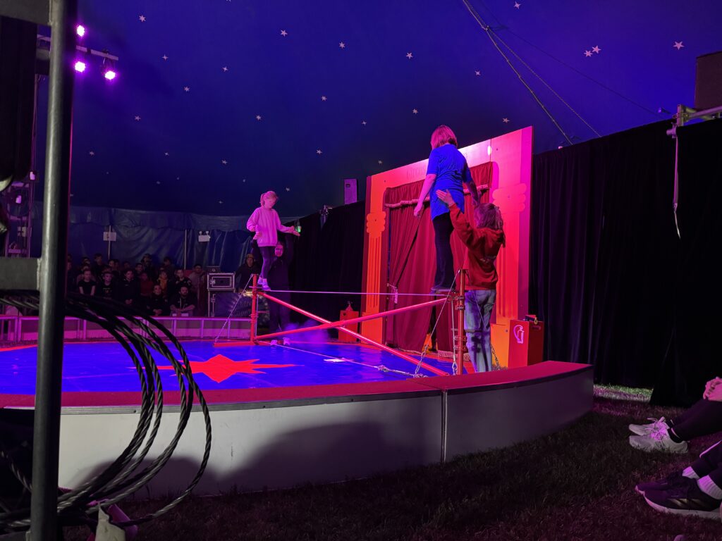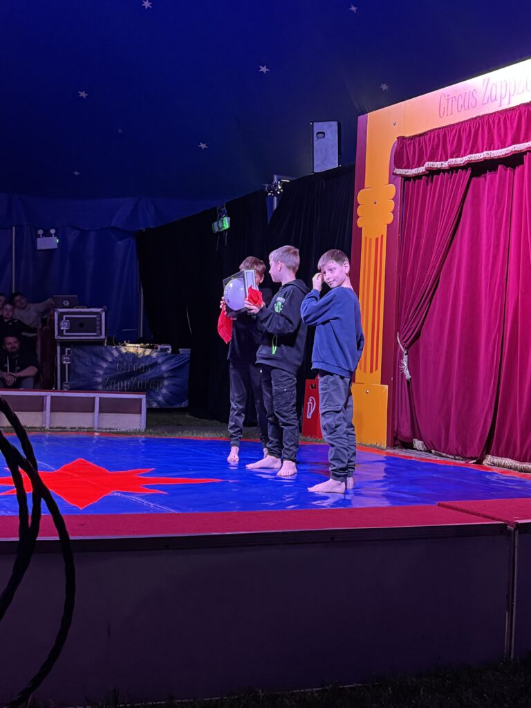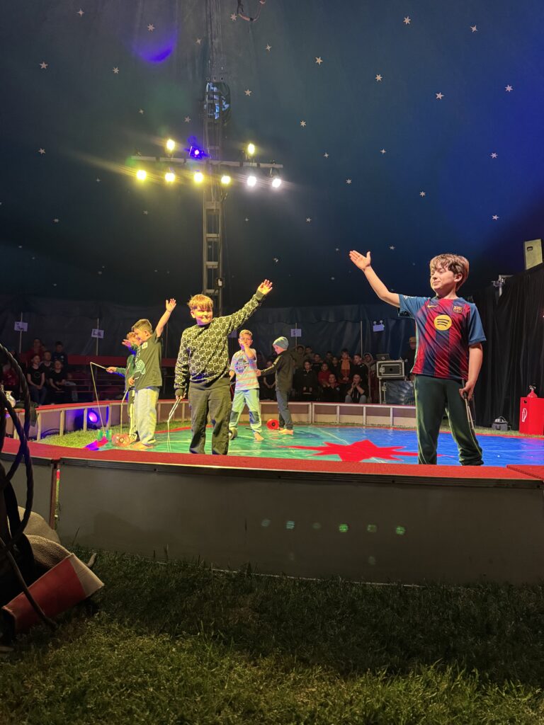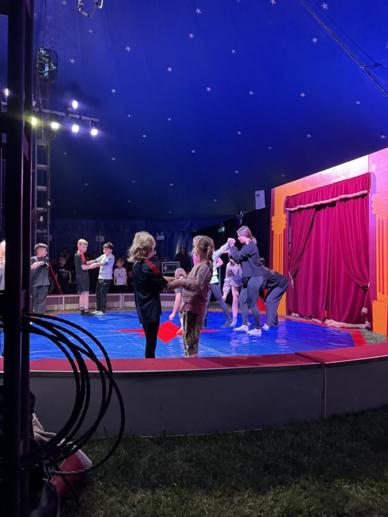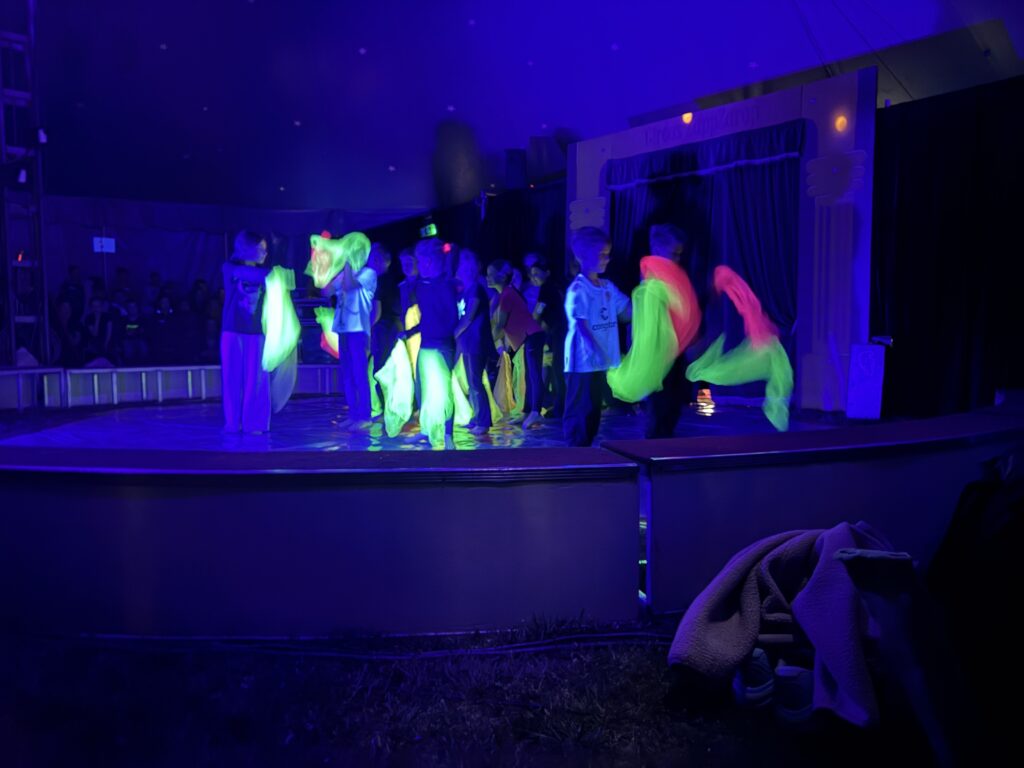 Anschließend ging es in eine lange Trainingsphase, bei der sich die einzelnen Gruppen auf die „Kostprobe“ am Mittag vorbereitet haben. Pünktlich um 11:30 Uhr ging die Musik im großen Zelt an, ein Zeichen für alle, dass die Übungsphase vorbei war und alle Gruppen ihre „Kostproben“ vom Tag präsentieren konnten. Alle Kinder sollten die Möglichkeit bekommen, die Manege kennenzulernen und erste Laufwege im „Backstage-Bereich“ einzuüben. Denn hinter dem Vorhang herrscht absolute Einbahnstraßen-Pflicht und vor allem Ruhe. Die Wege in und aus der Manege wurden geübt und jede Gruppe konnte dem begeisterten Publikum ihre ersten Arbeiten vorstellen. Mit Musik, Licht und Schwarzlicht wirkten die kleinen Shows gleich noch viel professioneller.