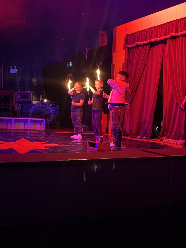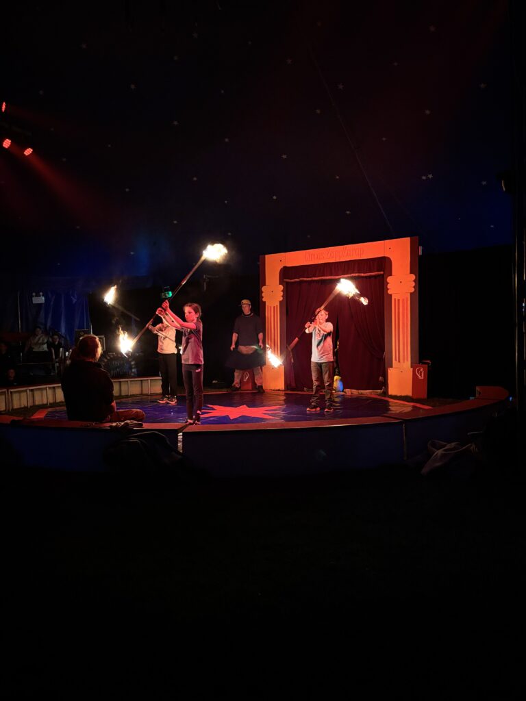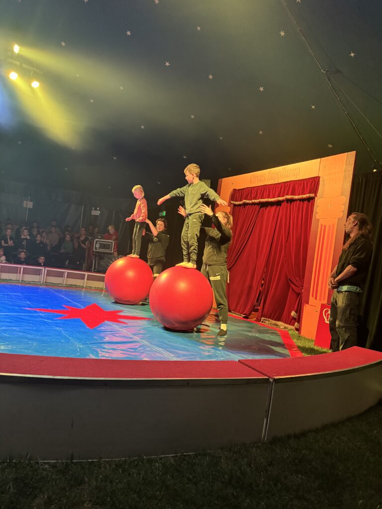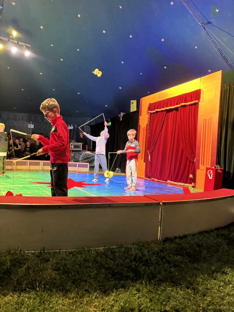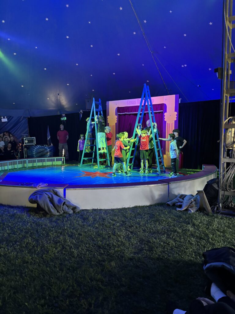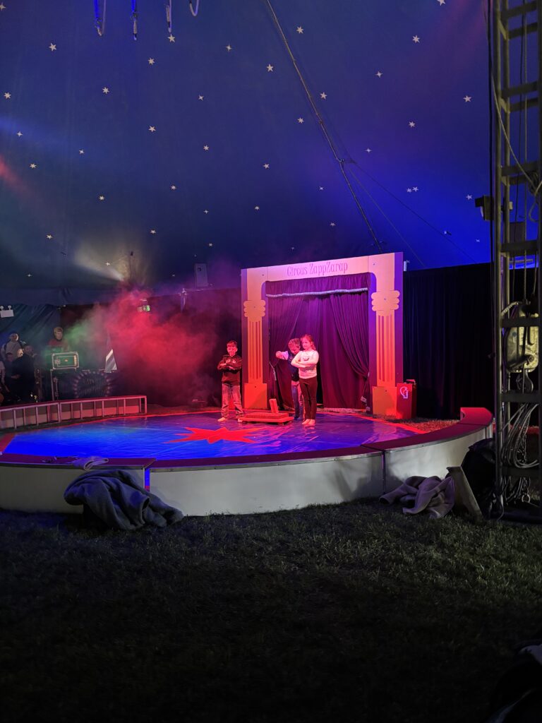 Anschließend ging es in eine lange Trainingsphase, bei der sich die einzelnen Gruppen auf die „Kostprobe“ am Mittag vorbereitet haben. Pünktlich um 11:30 Uhr ging die Musik im großen Zelt an, ein Zeichen für alle, dass die Übungsphase vorbei war und alle Gruppen ihre „Kostproben“ vom Tag präsentieren konnten. Alle Kinder sollten die Möglichkeit bekommen, die Manege kennenzulernen und erste Laufwege im „Backstage-Bereich“ einzuüben. Denn hinter dem Vorhang herrscht absolute Einbahnstraßen-Pflicht und vor allem Ruhe. Die Wege in und aus der Manege wurden geübt und jede Gruppe konnte dem begeisterten Publikum ihre ersten Arbeiten vorstellen. Mit Musik, Licht und Schwarzlicht wirkten die kleinen Shows gleich noch viel professioneller.